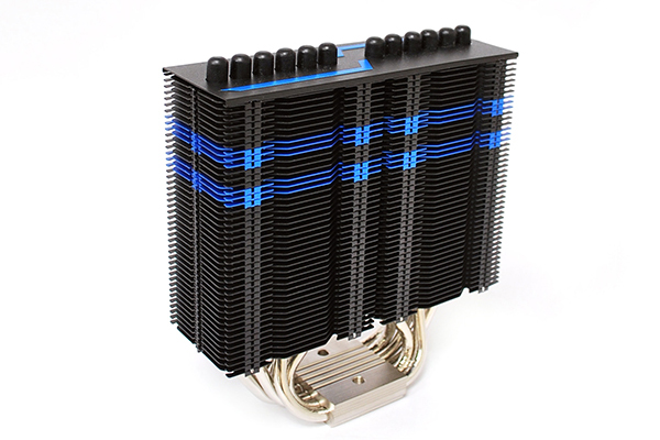 這個特殊版的世界末日的鰭片顏色從單調的銀白色換成了黑色和藍色,讓散熱器看上去酷炫很多,散熱器尺寸為144*50*160.3mm,重750g,配備6根6mm直徑熱管,支持Intel LGA 775/1366/1155/1156/1150/2011平臺,最多可以安裝兩部14cm的風扇。